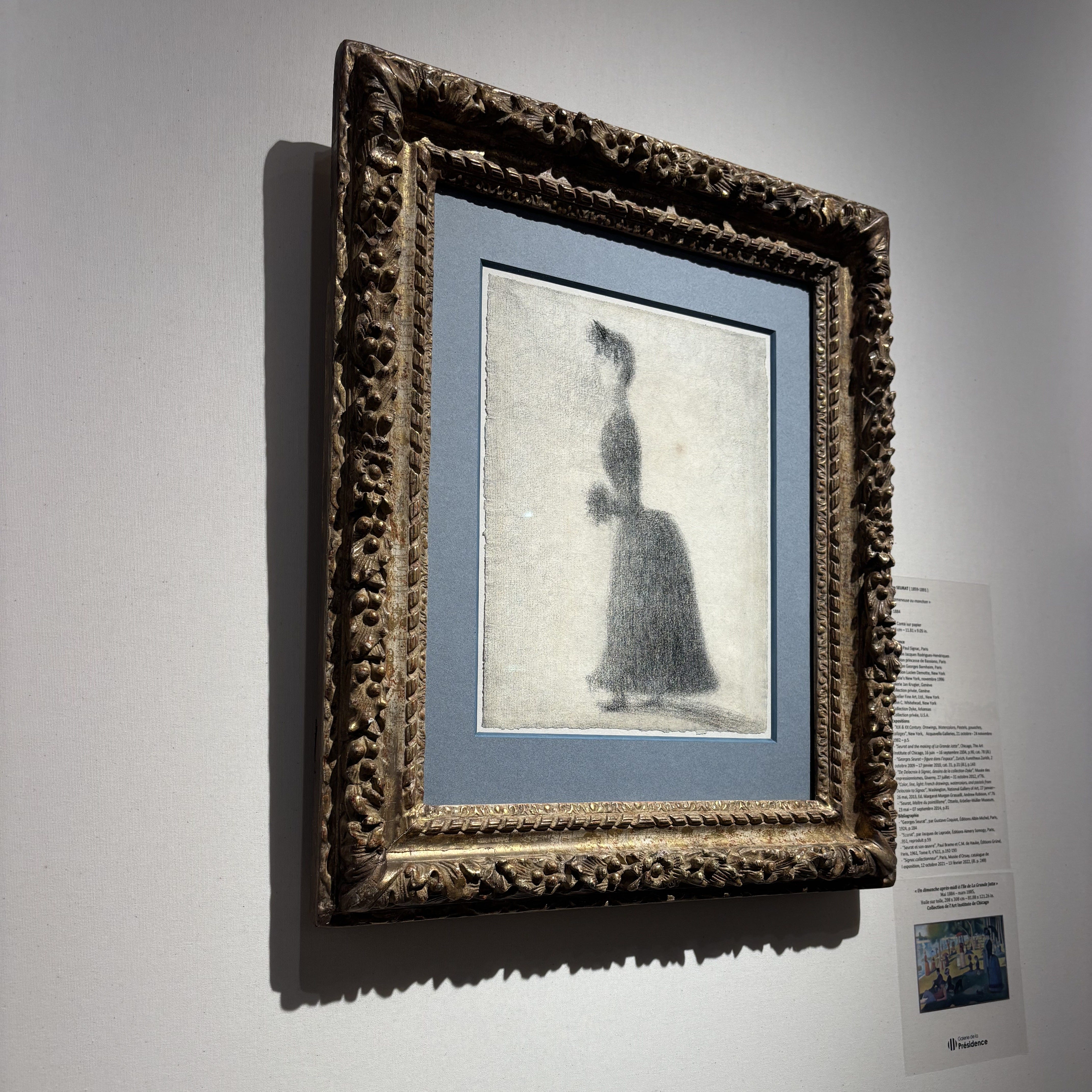 As I went through the salon, I saw a sheet of paper on which Pisarro was refining the male form — including a sensible depiction of male pattern baldness; a drawing from an Italian Renaissance sculptor that would be later immortalized in marble; a sketch in which Seurat was perfecting the form and shadow of the bustle from the woman I can only correctly refer to as “Dot” in his famous “Un dimanche après-midi à l’Ile de La Grande Jatte”.
